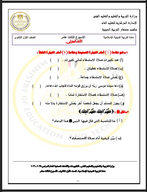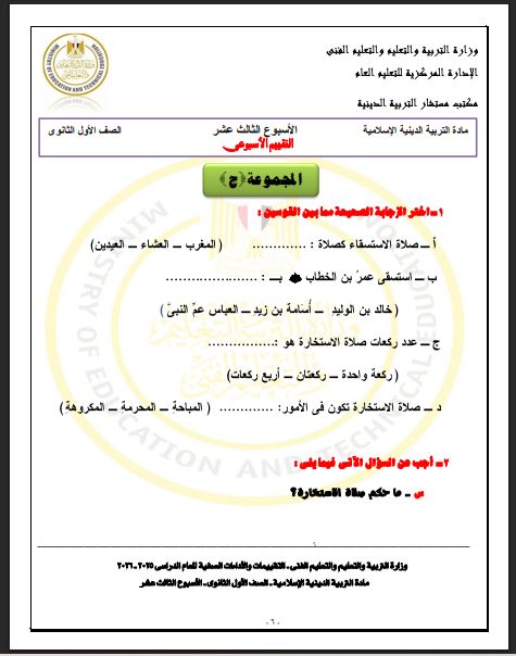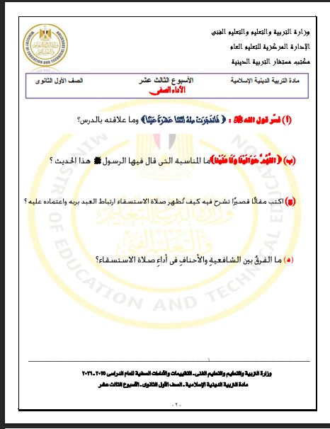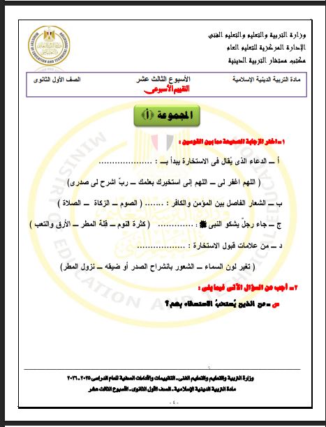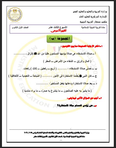 أسئلة تقييم الأسبوع الـ 13 التربية الاسلامية أولى ثانوي