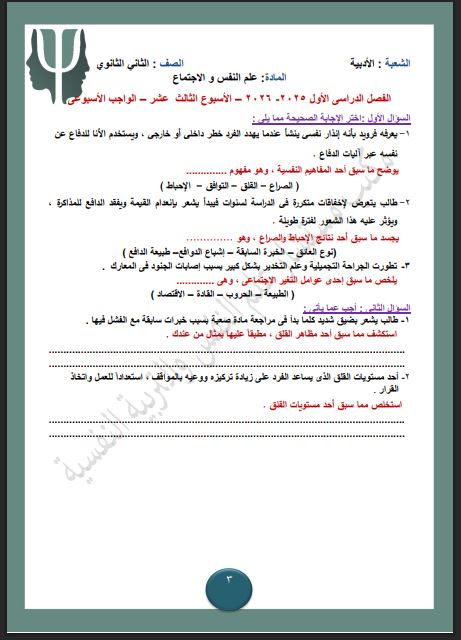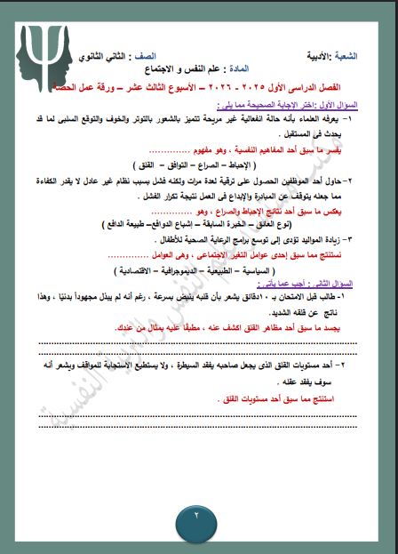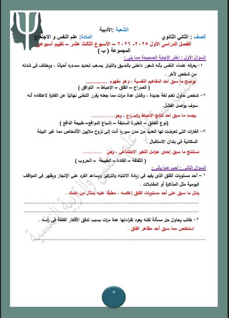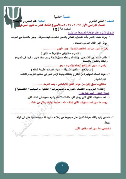 أسئلة تقييم الأسبوع الـ 13 علم النفس والاجتماع ثانية ثانوي