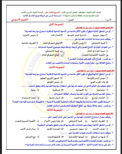أسئلة تقييم الأسبوع الـ 13 الجغرافيا ثانية ثانوي