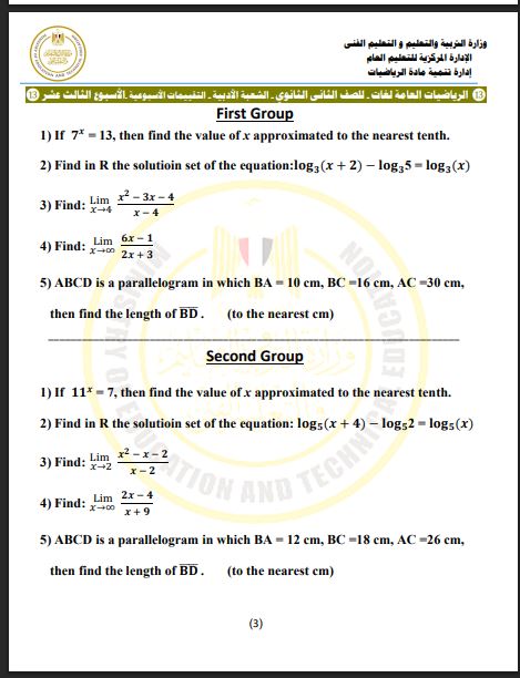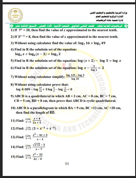 أسئلة تقييم الأسبوع الـ 13 الرياضيات العامة لغات ثانية ثانوي
