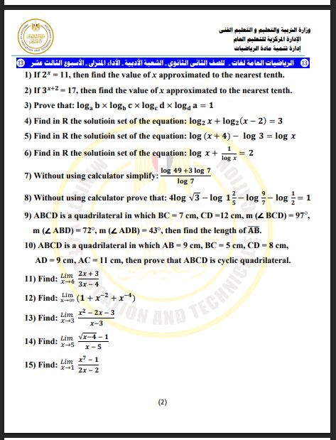 مراجعات نهائية.. أسئلة تقييم الأسبوع الـ 13 الرياضيات البحتة الصف الثاني الثانوي
