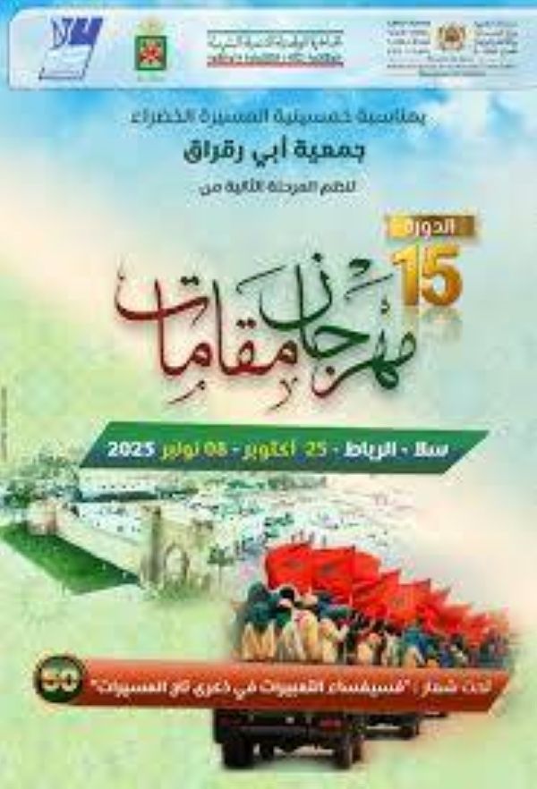 بشراكة مع وزارة الشباب والثقافة والتواصل-قطاع الثقافة - والمبادرة الوطنية للتنمية البشرية (عمالة سلا) ، تنظم جمعية أبي رقراق تخليدا للذكرى الخمسين للمسيرة الخضراء؛ المرحلة الثانية للدورة 15 لمهرجان مقامات، و ذلك في الفترة ما بين 25 اكتوبر و 8 نونبر 2025؛ بعدد من الفضاءات في سلا والرباط.