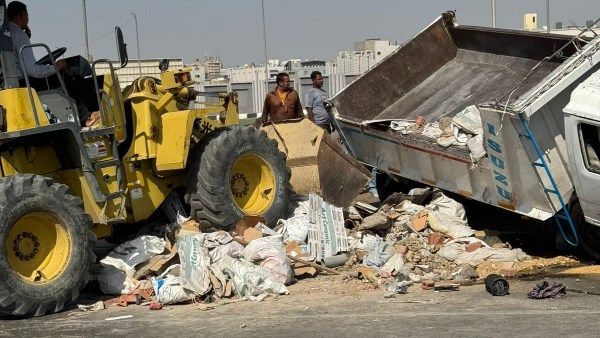 بالانتقال والفحص، تبين انقلاب سيارة نقل محملة بمخلفات البناء، تحمل لوحات معدنية أرقام (و ب ر 7642) ، قيادة السائق" محمد.إ.م" (بدون إصابات) وأسفر الحادث عن وجود بقعة سولار على مساحة 5 متر تقريباً، نتيجة كسر بتانك السولار، وتم التعامل معها بمعرفة القوات ووقف الانسكاب، واتخاذ الإجراءات القانونية اللازمة تجاه الواقعة.