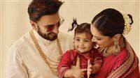 ديبيكا تألقت بساري أحمر مطرز بخيوط ذهبية ومجوهرات تراثية فخمة، بينما اختار رانفير زيًّا هندياً باللون العاجي مع إكسسوارات بسيطة، أما الصغيرة “دعاء”، فبدت نسخة مصغّرة من والديها، مرتدية فستانًا أحمر مطابقًا لإطلالة والدتها، لتكتمل الصورة العائلية بمزيج من الأناقة والدفء.