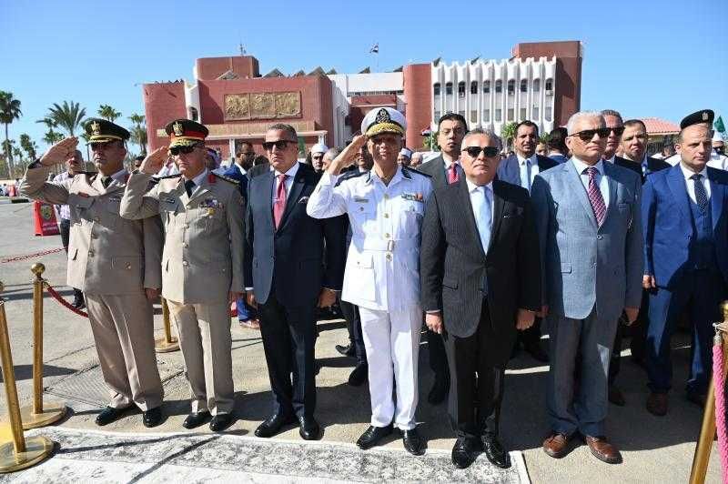 وبدأت المراسم بعزف السلام الوطني لجمهورية مصر العربية، تلاه الوقوف دقيقة حدادًا على أرواح الشهداء، ثم قام المحافظ بوضع الإكليل وتحية النصب التذكاري.
