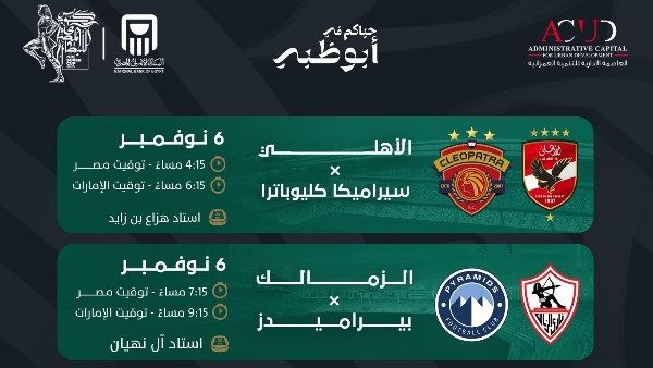 الزمالك × بيراميدز – الساعة 7:15 مساءً بتوقيت القاهرة على استاد آل نهيان في أبوظبي.