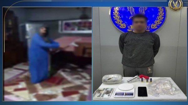 وبتفتيشه، عُثر بحوزته على فرد خرطوش وعدد من الطلقات ولفافة كبيرة من نبات الهيدرو المخدر، و238 كيسًا من مخدر الهيروين، ومبلغ مالي، وهاتف محمول، وميزان حساس يُستخدم في عملية الوزن والتوزيع.