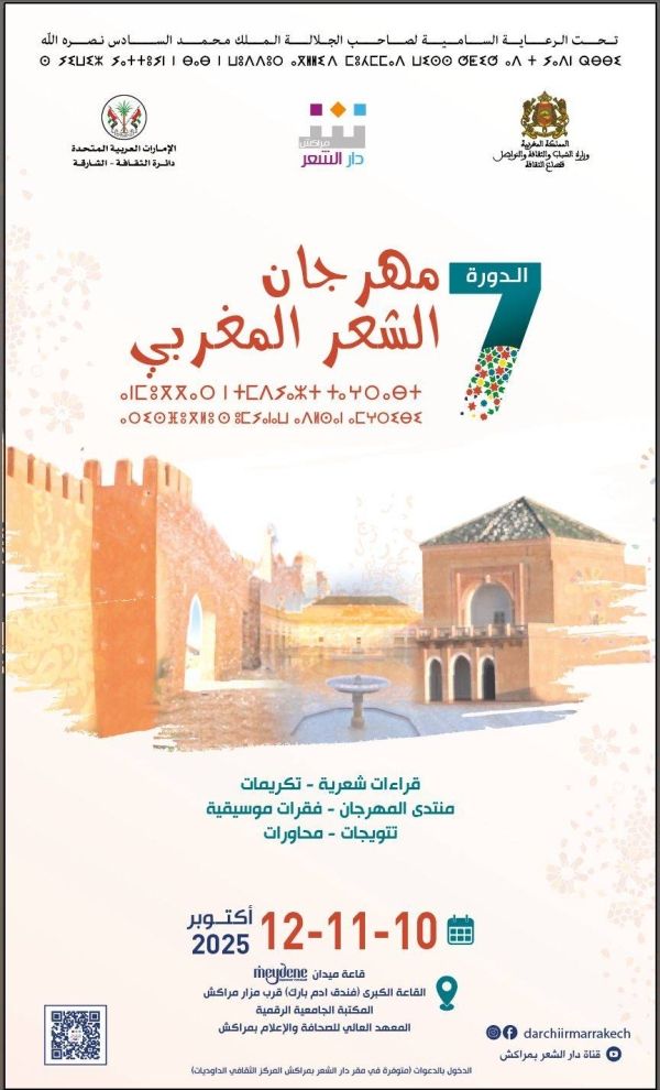 تنظم دار الشعر بمراكش الدورة السابعة من مهرجان الشعر المغربي، أيام: 10و11و12 أكتوبر 2025، بمدينة مراكش. المهرجان الذي يجسد عمق التعاون الثقافي المشترك، الذي يجمع بين وزارة الشباب والثقافة والتواصل، في المملكة المغربية ودائرة الثقافة في حكومة الشارقة، بدولة الامارات العربية المتحدة.