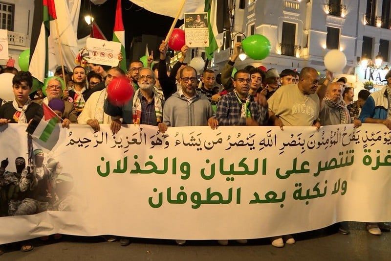 وانطلقت المسيرة، التي دعت إليها المبادرة المغربية للدعم والنصرة، من ساحة الأمم مرورا بشارع محمد الخامس، قبل أن تصل إلى ساحة سور المعكازين، رفع فيها المشاركون الأعلام الفلسطينية والمغربية وصور قيادات “حماس” الذين قضوا في معركة “طوفان الأقصى”.