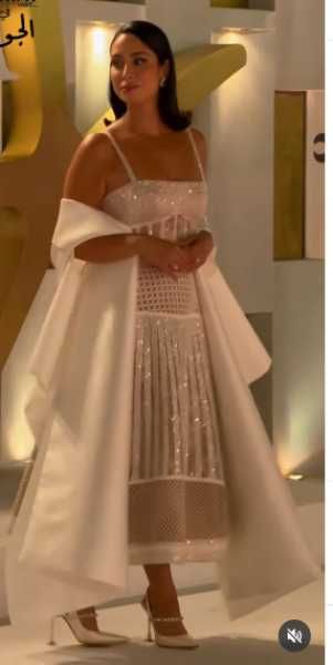 تابع :"الاطلالة خيالية ، اجمل اطلالة بالحفل، الفستان مع الكيب مع الشوز ، بساطة الشعر و المكياج و المجوهرات الناعمين كل شي صح بهل اطلالة، تقيمي 9/10."
