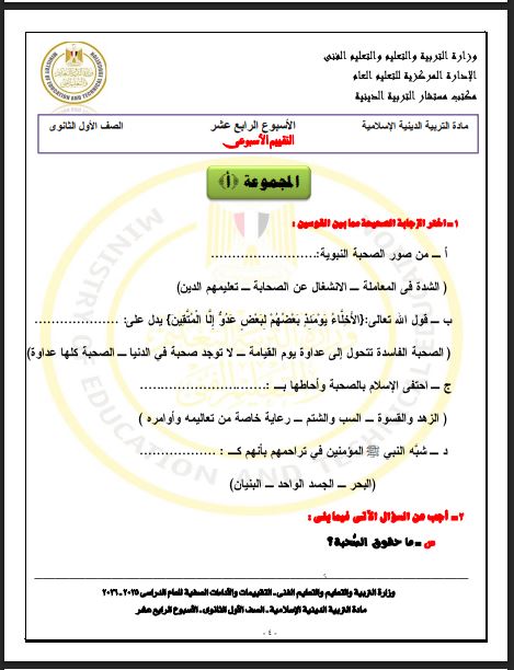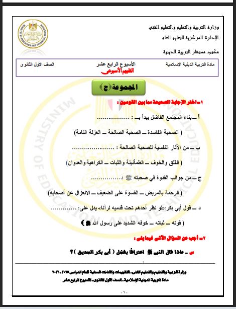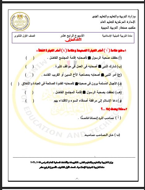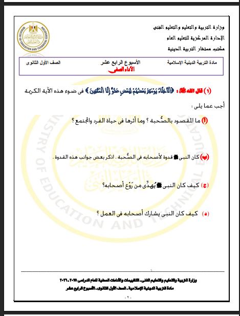 أسئلة تقييم الأسبوع الـ 14 التربية الاسلامية أولى ثانوي