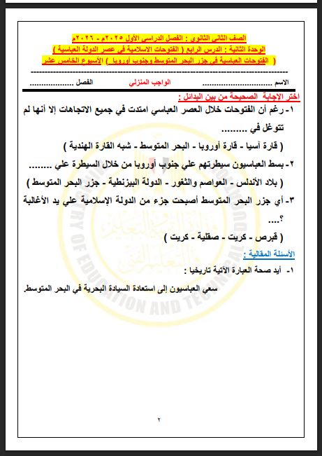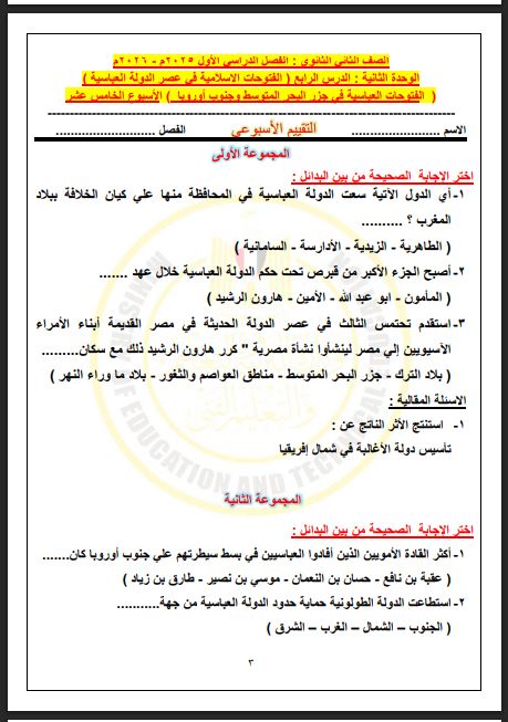 أسئلة تقييمات الأسبوع الـ 14 في التاريخ وإجابتها الصف الثاني الثانوي 2025