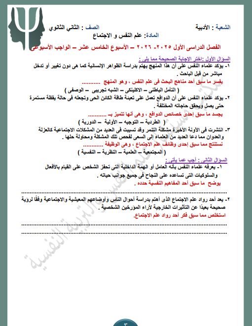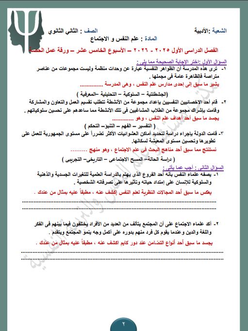 لطلاب الصف الثاني الثانوي.. أسئلة تقييمات الأسبوع الـ 14 علم النفس والاجتماع